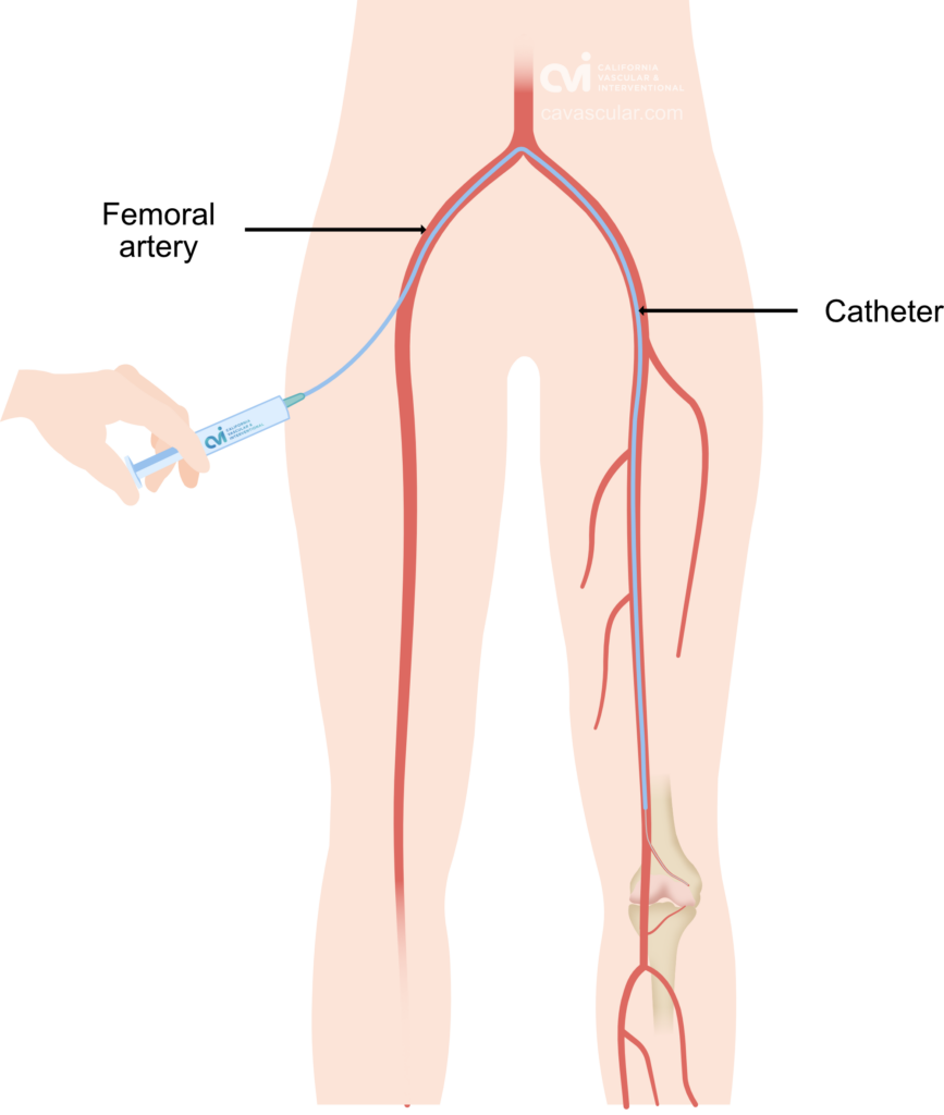 Geniculate artery embolization is an outpatient non-surgical procedure with minimal downtime. The procedure is done in an outpatient state of the art center where our interventional radiologist performs the treatment through a tiny tube called a catheter. This procedure can be performed by placing the catheter in an artery at the top of the leg (called a femoral approach).
