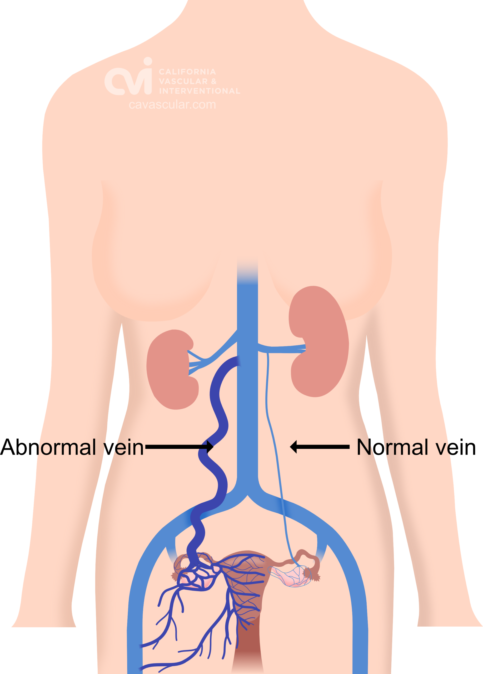 The abnormal veins dilate and cause varicose veins around the ovary and uterus because the valves don’t work properly. Blood flow is in the wrong direction, pooling in the veins and causing them to enlarge.