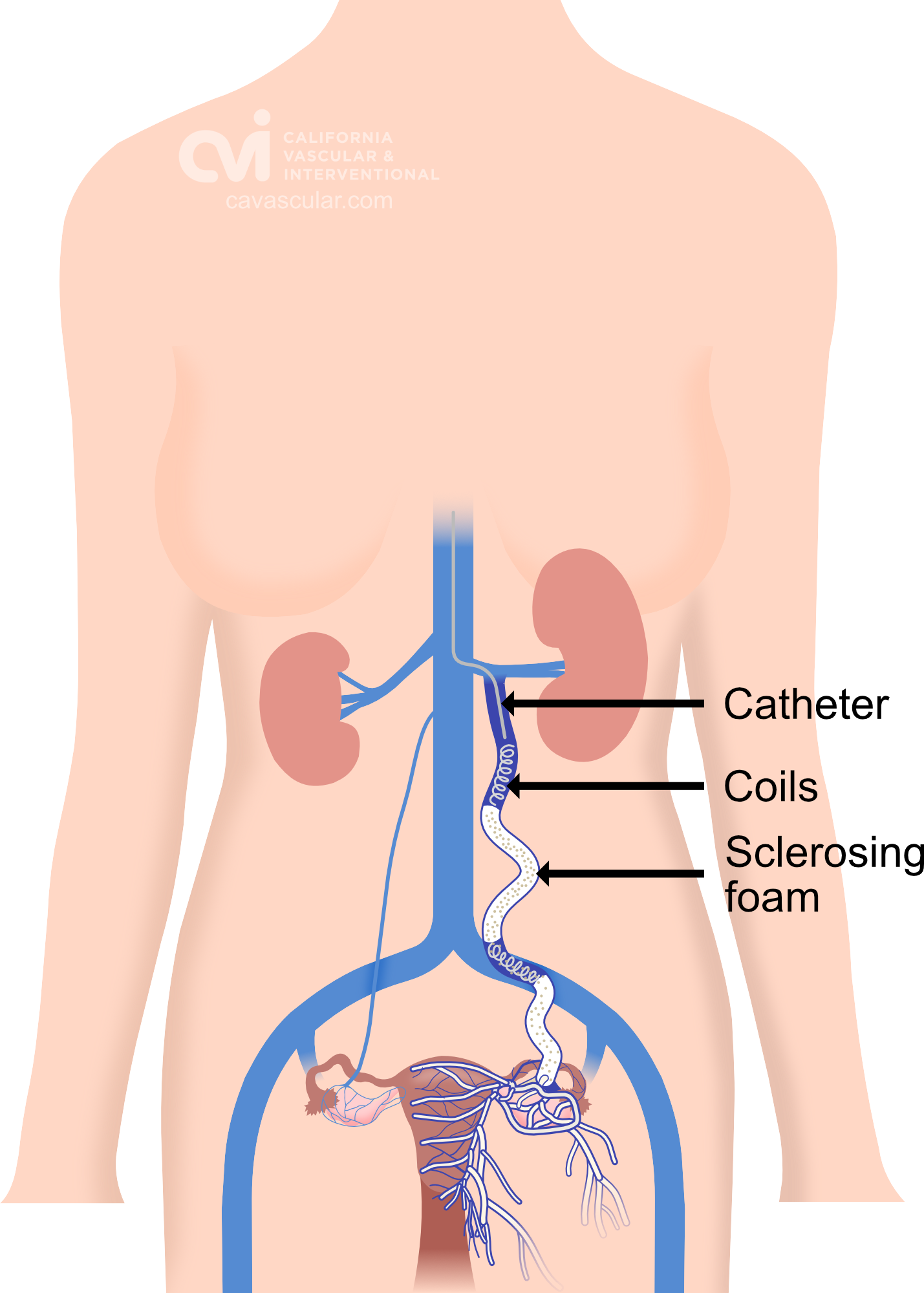 Using x-ray guidance a smaller catheter is then guided into the abnormal ovarian or pelvic veins. The abnormal vein is then treated by placing tiny coils and a specialized fluid causing the vein to seal down. This then restores normal blood flow in the body and improves related symptoms.